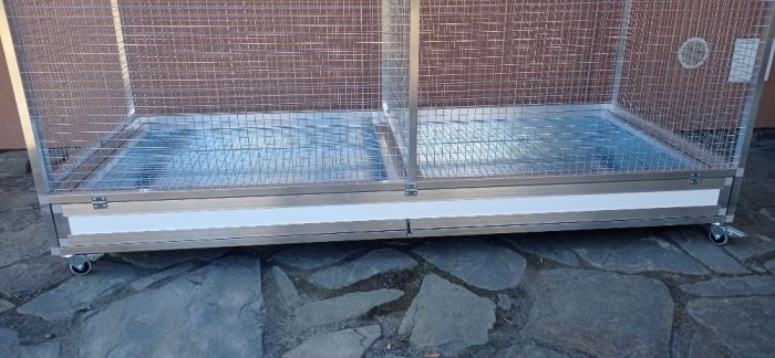Voliéra rozměry 170x170x70cm ,pletivo esafort 19x19x1,5mm,výsuvné šuplíky,výsuvné rošty nad šuplíky , výsuvné krmné pulty nerez objem misek 350ml , vyjímatelná přepážka pro rozdělení voliéry na dvě samostatné části , obslužná dvířka 2x