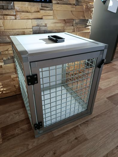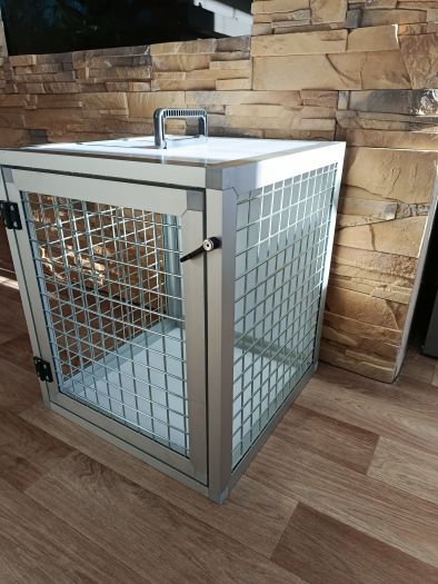 Přepravka pro větší papoušky (Žako, Amazoňan)Rozměr 40x40x47 cm , konstrukce Al profil 20x20 povrchová úprava stříbrný elox, dno a zadní stěna bílá kompozitní deska, síta galvanický zinek,oko 30x30 mm síla drátu 3mm.
