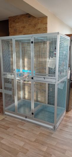 Rozměr 140x180x75 cm , konstrukce Al profil 20x20 mm , povrch stříbrný elox, výplně svařované síta oko 30x30 mm, síla drátu 3mm ,galvanický zinek ,vysuvné nerezové krmné pulty ,výsuvné šuplíky pozinkovaný plech